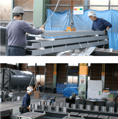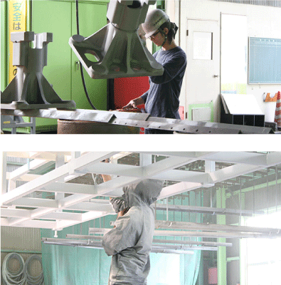 本社(豊栄工場) 塗装作業スペース 580m2 ブラスト室H4m×W5m×L15m1室 コンプレッサー1台 スチールグリッドブラスト2台 天井クレーン(5.0t)1基 天井クレーン(2.8t)4基 新発田工場 塗装作業スペース 500m2 ブラスト室H5m×W5.5m×L9m2室 焼付炉H3m×W3m×L7m1炉 コンプレッサー1台 スチールグリッドブラスト2台 天井クレーン(2.8t)4基 天井クレーン(1.5t)2基